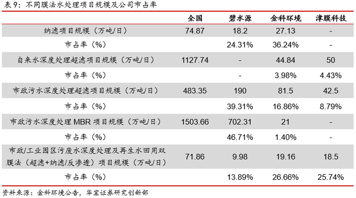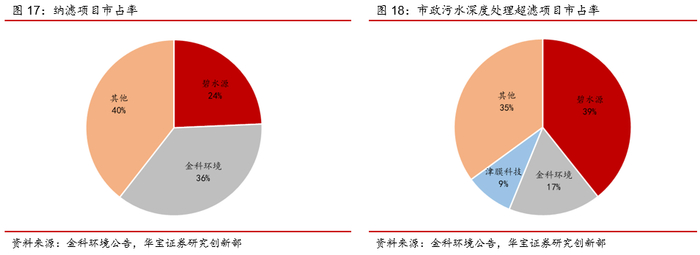 膜法水处理行业集中度较高,龙头公司聚焦领域有所不同。从膜法水处理市场格局来看,碧水源、金科环境、津膜科技占据膜法水处理的主要市场份额,且不同公司聚焦于不同的膜法水处理项目领域。在纳滤项目中,碧水源、金科环境的市占率分别为24%、36%,CR2为60%;市政污水深度处理超滤项目碧水源、金科环境、津膜科技的市占率分别为39%、17%、9%,CR3位65%;市政污水深度处理MBR项目碧水源、金科环境的市占率分别为47%、1%,CR2为48%;市政/工业园区污废水深度处理及再生水回用双膜法(超滤+纳滤/反渗透)项目碧水源、金科环境、津膜科技的市占率分别为14%、26%、26%,CR3为66%。
