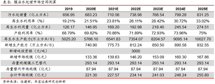 6)膜工艺占比:假设全国再生水新增产能中膜工艺占比为60%;假设存量再生水产能中已有30%的项目采用膜工艺,剩余产能中2020-2025年将有50%产能更换为膜工艺,产能在该期间匀速投放;