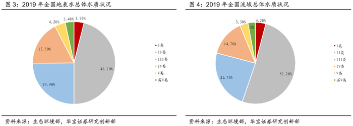 水质逐年改善,污染治理问题仍不可忽视。根据生态环境部发布的《中国生态环境状况公报》,2019年,全国地表水I-III类水质断面占比为74.9%,相较于2018年提升3.9个百分点,劣V类水质断面占比为3.4%,相较于2018年下降3.3个百分点;全国七大流域中I-III类水质断面占比为79.1%,相较于2018年提升4.8个百分点,劣V类水质断面占比为3.0%,相较于2018年下降3.9个百分点。由此可见,地表水、流域水体水质逐年改善,污水治理已取得一定成效,但V类和劣V类水质占比不可忽视,污染问题仍较为突出。