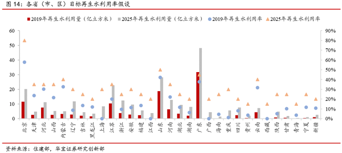 其他地区:《建设规划》要求2020年其他城市和县城再生水利用率力争达到15%,假设其他地区2025年基准再生水利用率为20%,并根据各地经济发达情况及目前再生水利用率情况,对目标再生水利用率进行调整。