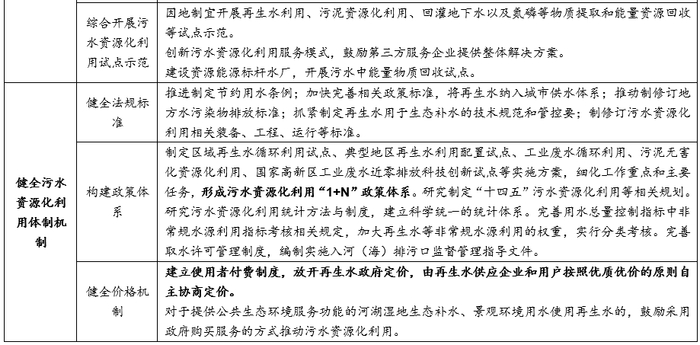 建立使用者付费制度,完善财金政策。此外,《指导意见》指出,建立使用者付费制度,放开再生水政府定价,由再生水供应企业和用户按照优质优价的原则自主协商定价。对于提供公共生态环境服务功能的河湖湿地生态补水、景观环境用水使用再生水的,鼓励采用政府购买服务的方式推动污水资源化利用。加大中央财政资金对污水资源化利用的投入力度。支持地方政府专项债券用于符合条件的污水资源化利用建设项目;鼓励企业采用绿色债券、资产证券化等手段,依法合规拓宽融资渠道;稳妥推进基础设施领域不动产投资信托基金试点;探索开展项目收益权、特许经营权等质押融资担保。