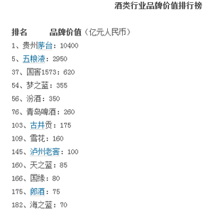 1月21日,胡润研究院发布《2020胡润品牌榜》,贵州茅台以10400亿品牌价值位列第一,天猫品牌价值为4900亿位列第二,中华品牌价值为3350亿位列第三。酒类行业品牌总价值为15815亿,其中,贵州茅台品牌价值10400亿,其余品牌价值之和为5415亿。