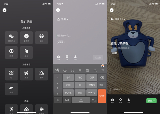 选择相应的状态后,用户仍需要输入1个以上的字符完成状态编辑,在这个页面你还可以给自己的状态加话题、加图片、加坐标,编辑完成后点击「就这样」即可。如果不添加任何图片,状态则会在「我」的页面以纯色背景展示,背景颜色随机。