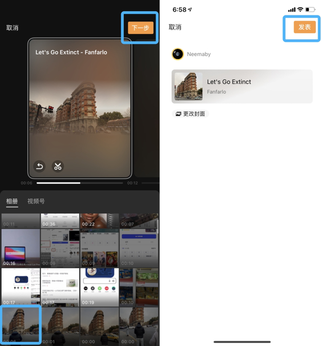 点击后音乐则按照歌词分为了不同的秒数,你可以依次选择歌词开始创作。创作后直接生成视频,可以在视频号进行发表。视频号页面也分为了动态和音乐视频两个版块,发表的视频会出现在「音乐视频」内,下方还显示你制作视频的原创度。