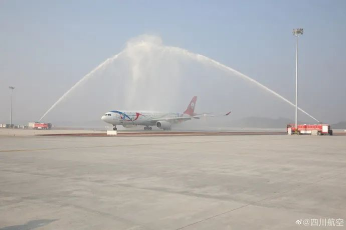 飞机滑行过程中,两侧早已就位的消防车喷出巨型水柱,以民航界最高礼仪——“过水门”仪式向它们表示热烈欢迎。