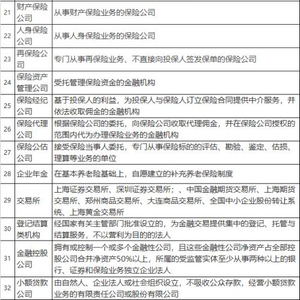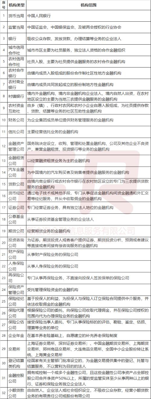 《金融机构编码规范》承认32类机构为“金融机构”,同时对各类金融机构的范围进行了定义:
