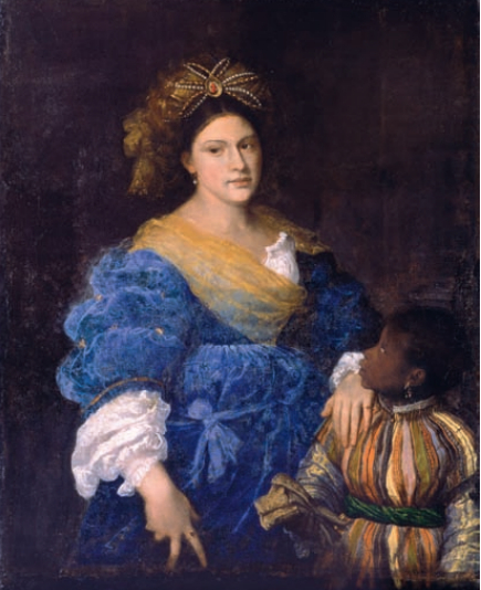 提香《劳拉和她的侍从男孩画像》,16世纪20年代晚期,布面油画,114.3厘米×91.5厘米,海因茨·基斯特斯系列藏品