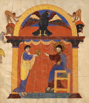《基督向圣约翰传播福音》 摘自《列巴那的圣贝亚图斯注解启示录》1028-1072年,内文局部;法国国家图书馆,巴黎