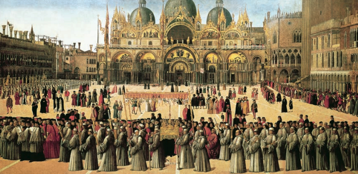 真蒂莱·贝利尼《圣马可广场上的游行》 1496年,布面蛋彩油画,3.67米×7.45米;学院美术馆,威尼斯