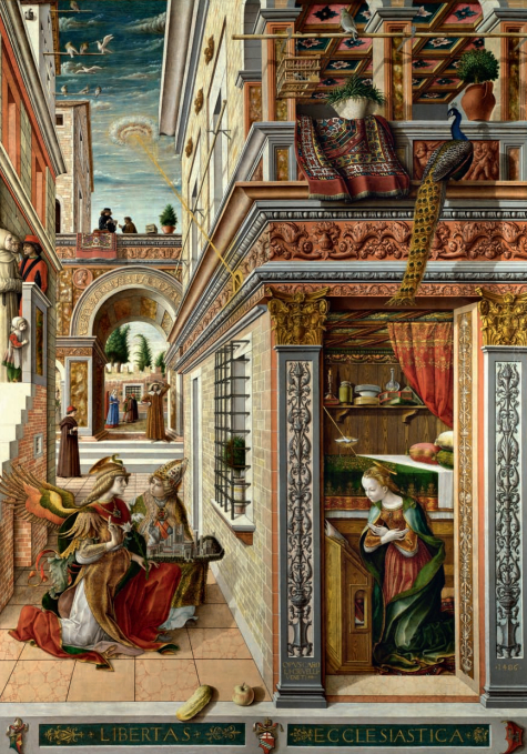 卡罗·克里韦利《天使与圣埃米迪乌斯向圣母报喜》1486年,布面蛋彩油画,207厘米×146.7厘米;国家画廊,伦敦