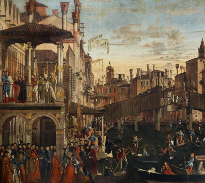 维托雷·卡巴乔《里阿尔托桥的神迹》,1496年,布面蛋彩油画,3.65米×3.89米;学院美术馆,威尼斯