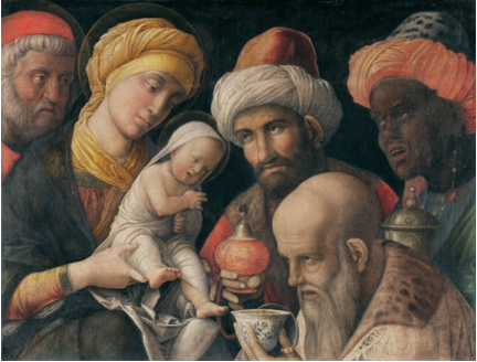 安德烈亚·曼特尼亚《三博士来朝》约1495-1505年,亚麻布胶画,48.6厘米×65.6厘米;保罗·盖蒂博物馆,洛杉矶