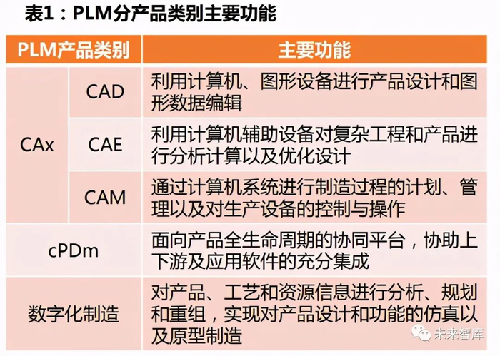 ⚫ PLM产品主要可以分为CAx,cPDm和数字化制造三类:PLM将计算机辅助设计(CAD),辅助分析(CAE)、 辅 助制造(CAE)以及产品数据管理(PDM)等系统衔接一体,使企业能够对产品服务从设计、研发、生产最终报废 等全生命周期的设计及信息进行高效和经济的应用、集成与管理。