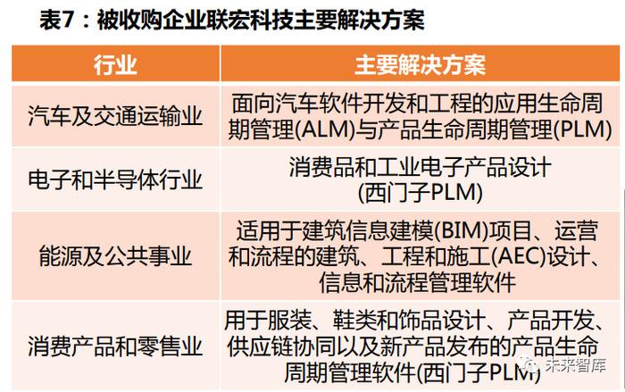 ⚫ 收购联宏科技,拓展完善PLM业务:2018年,公司收购为汽车、通用机械、工业电子等制造企业提供PLM软件服 务的企业联宏科技,以实现业务链的有效互补协同,进一步强化公司在细分领域的竞争力,提升市场占有率。