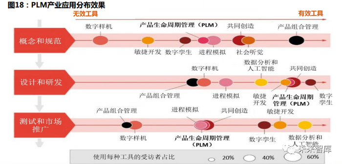 ⚫ PLM在主要通过与人工智能(AI)和机器学习(ML)两大领域结合而推动工业4.0的发展,其在设计和研发 方面应用最为广泛:智能互联产品的开发和管理方式正在改变PLM的实现途径,用户对于PLM的使用将不再 局限于管理层面,而是在此基础之上寻求产品/业务的优化与创新。;在AI和ML的先进企业中,61%已完全集 成的PLM系统,而未接触两者的企业中,PLM的应用比例仅为12%。