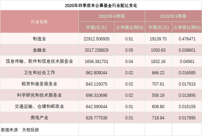 分行业来看,天相投顾数据显示,制造业仍为公募基金持有市值最高的行业,金融业、信息传输、软件和信息技术服务业、卫生和社会工作等行业紧随其后。