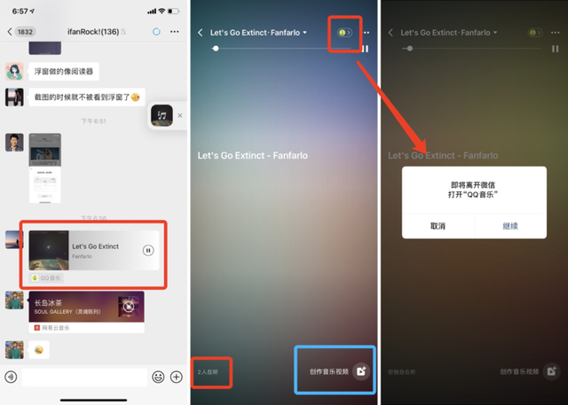 右下角则是「创作音乐视频」。当你收到其他好友分享的音乐时,则可以点击右上角的「…」看到「创作音乐视频」的入口。