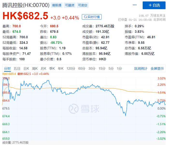 1月21日,港股恒指一度突破3万点大关,同时腾讯控股突破700港元大关,市值高达6.7万亿港元。最终收盘,腾讯涨0.44%,报价682.5港元,市值6.5万亿港元。