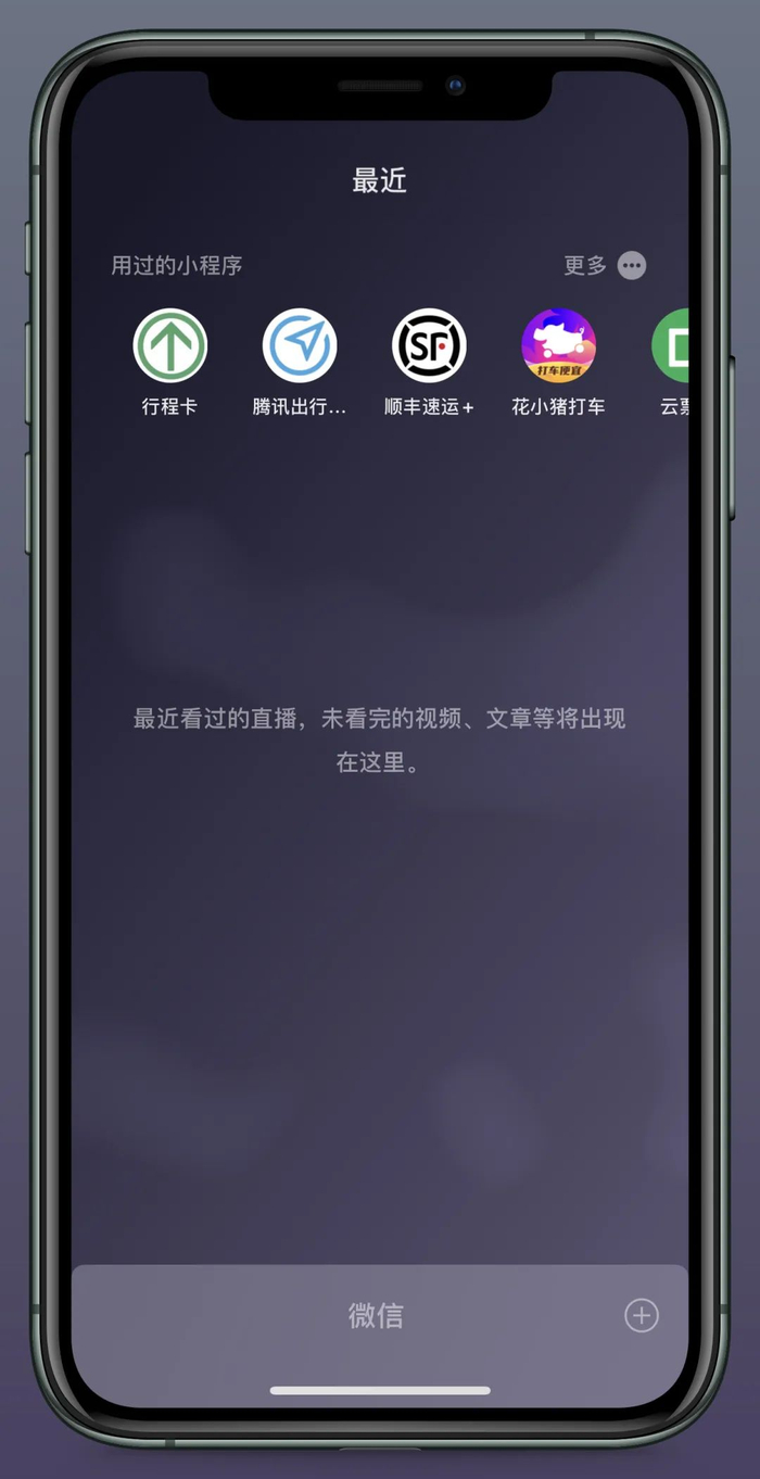 微信 8.0 版本丰富了上拉界面的显示内容,以往只显示收藏和常用小程序的内容,现在「最近看过的直播」「未看完的视频」「未看完的文章」等内容也会在这个页面下展示。