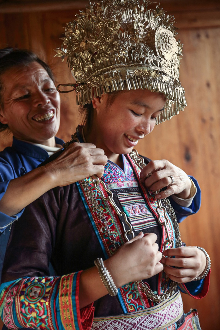2012年8月24日,贵州,吴太太一生中第一次为女儿装扮,这是她亲手为女儿制作准备的传统服装,以庆祝女儿的大学入学。