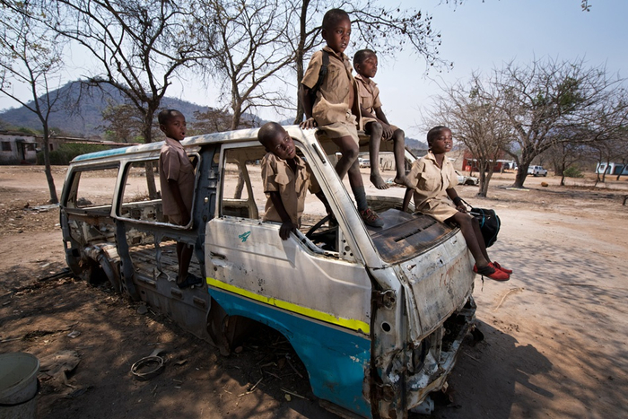 2016年9月28日,在津巴布韦受灾最严重的省份马欣革,植被已经枯萎,牲畜正在死亡,人们面临严重的饥荒风险。孩子们在一辆被毁的面包车里玩耍。
