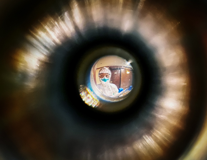2020年11月29日,一名医生要求摄影师在隔离期间进行每天报告两次体温。摄影师通过门的窥视孔拍摄了这张照片。 本文图片 金峰