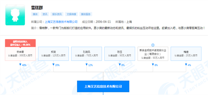 资料显示,此APP由一家上海艾艺信息技术有限公司外包开发。郑爽为这家公司投资了125万人民币,是第二大股东。