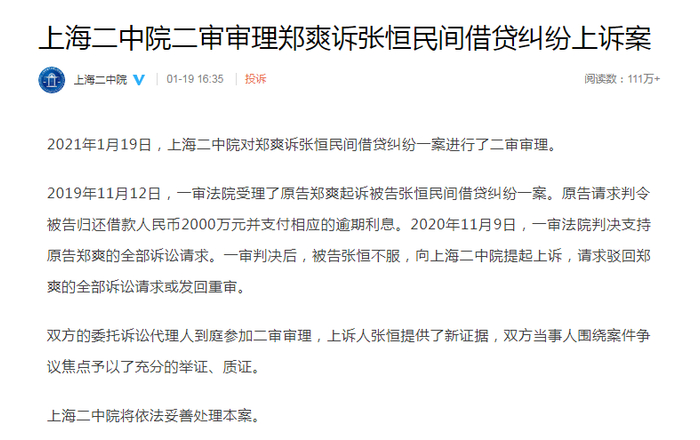 1月19日,上海二中院对郑爽诉张恒民间借贷纠纷案进行了二审审理。郑爽作为原告,要求张恒偿还2000万。