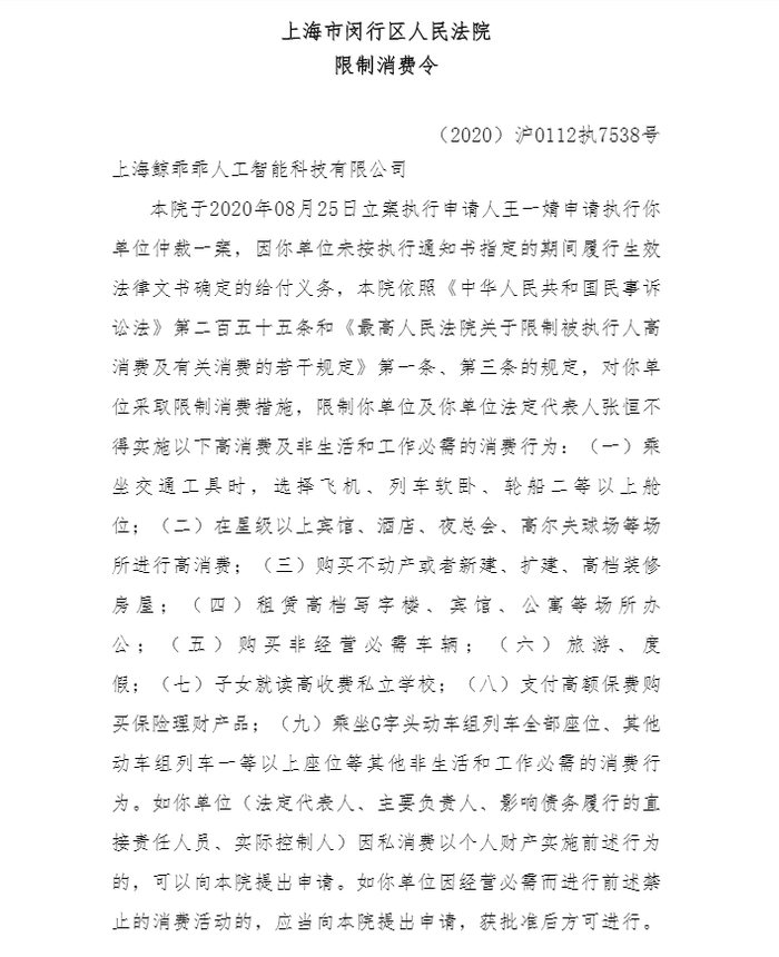 图| 作为公司法定代表人、执行董事,张恒被列入失信执行人名单