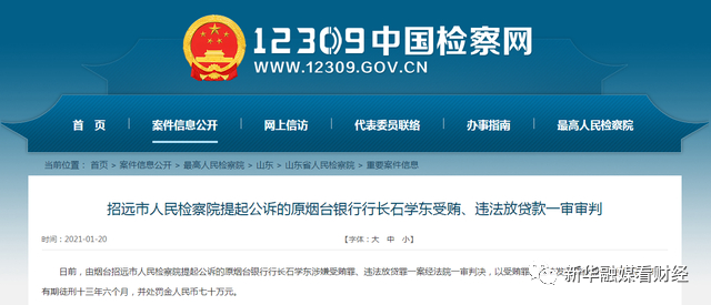 1月20日,12309中国检察网发布《招远市人民检察院提起公诉的原烟台银行行长石学东受贿、违法放贷款一审审判》。公告显示,日前,由烟台招远市人民检察院提起公诉的原烟台银行行长石学东涉嫌受贿罪、违法放贷罪一案经法院一审判决,以受贿罪、违法发放贷款罪合并判处石学东有期徒刑十三年六个月,并处罚金人民币七十万元。