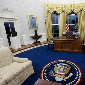 2017年初特朗普上任时曾带来过金色窗帘和地毯,不过1月20日这些东西都随同其主人一块离开了,回到办公室的是克林顿任总统时的深蓝色地毯和深金色窗帘。美国国旗和总统旗帜也取代了军队不同部门的旗帜。