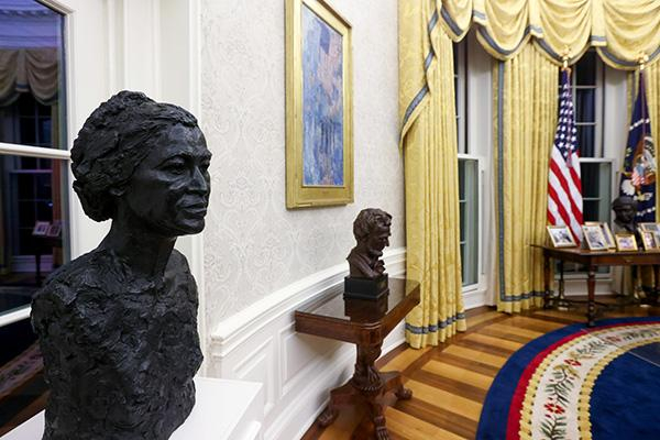 办公桌对面的壁炉两侧放置着美国民权运动领袖马丁·路德·金和曾任司法部长的罗伯特·肯尼迪的半身像。据说,拜登经常提到两人对黑人民权运动的影响。办公室里还有被称为“民权运动之母”的黑人女性罗莎·帕克斯(Rosa Parks)的半身像。1955年,帕克斯拒绝在公交车上给白人让座,后续的一系列事件被认为是拉开了民权运动的序幕。