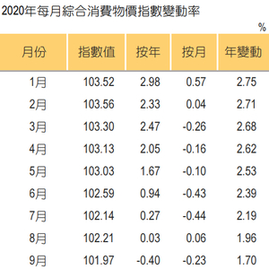 2020年各月综合消费物价指数按年变动在-0.88%至+2.98%之间。在疫情下1月至8月的按年升幅呈放缓趋势,在9月至12月更录得跌幅。