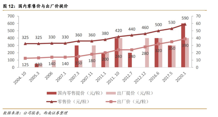 2016年到2019年,公司实现3次提价,同期销量由329万粒增至614万粒,CAGR高达23%。在提价和公司推进渠道建设及一核两翼战略的助推下,公司终端销量快速增加。目前,一粒3克的片仔癀零售价约为590元。