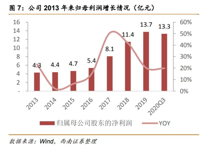 在净利润方面,其增速趋势和营收增速基本一致,在2013年到2016年的快速增长后,2017年开始出现明显向下趋势,并在2019年达到增速低谷。2020年,公司净利润增速有略微回暖。财报显示,2020年片仔癀实现归母净利润16.7亿元,同比增长27.21%。