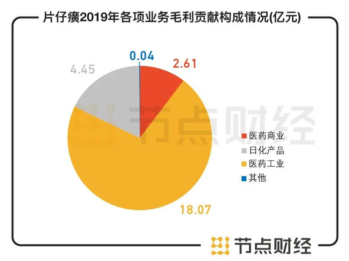 医药工业是公司最赚钱的业务,该板块的毛利率高达79.5%。从各个业务板块毛利率来看,医药商业毛利率为 9.4%,日化毛利率为70%。