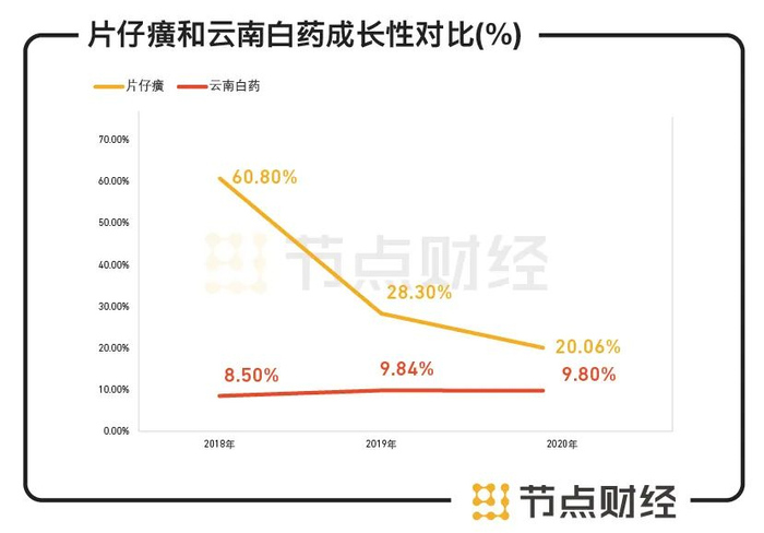 在成长性方面,片仔癀相比另一千亿中药巨头云南白药有一定优势。财报显示,2017年到2019年,云南白药的营收增速分别为8.5%、9.84%和9.8%,复合增长率低于10%;片仔癀的分别是60.8%、28.3%和20.06%,复合增长率超过35%,比前者高出两倍有余。