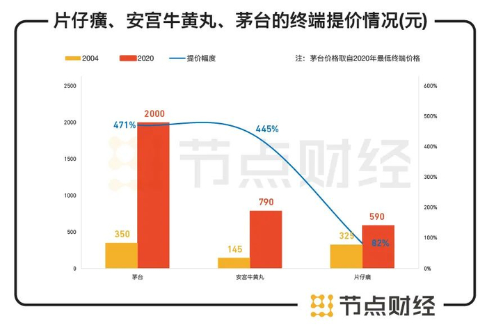 该报告认为,对标茅台和安宫牛黄丸,片仔癀的提价尚未触及天花板,未来的提价空间仍不小。数据显示,茅台在 2004年到2020 年零售价提价幅度为 471%,同期片仔癀的提价幅度为 82%,另一中药安宫牛黄丸从 1997 年到2020 年的提价幅度达 445%。