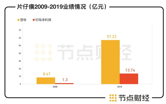 上市以来,片仔癀一直展示出业绩稳定增长的白马形象。从2009年到2019年的十年间,片仔癀的营收从8.67亿元增长至57.22亿元,年均复合增速(CAGR)达23.47%;归母净利润从1.3亿元增长至13.74亿元,CAGR达26.6%。