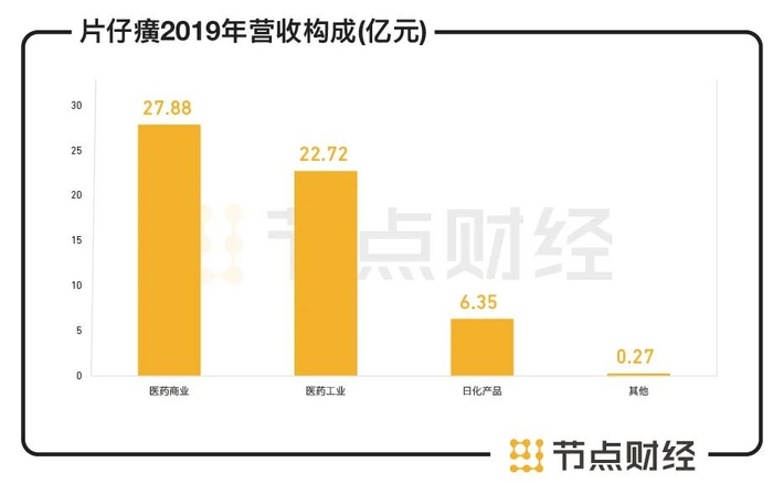 片仔癀系列产品是撑起这家公司的核心力量。目前,片仔癀的业务主要包括医药工业、医药商业、日用品、化妆品和食品等板块。其中,医药工业和医药商业为公司贡献了超八成营收,这些板块主要由片仔癀系列产品为主导。