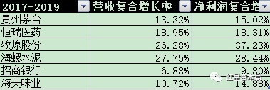 2017年至2019年,除招商银行,其余5家企业的营收复合增速与净利润复合增速均大于10%。贵州茅台、恒瑞医药、海天味业的营收与净利润增速均连续三年大于15%。