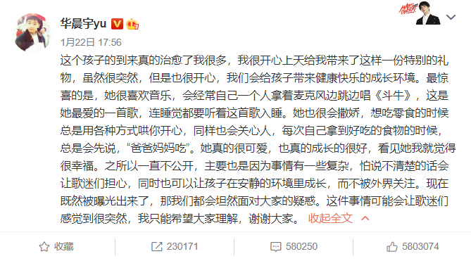 1月22日下午,华晨宇在微博上发布了一条“是的,我们有一个孩子”的信息,冲上热搜榜第一。