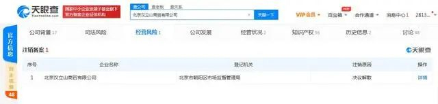 天眼查App显示,近日,北京汉立山商贸有限公司新增一条注销备案信息,清算组负责人为卢川,清算组成员为卢川,虞然,华晨宇。注销原因为决议解散,债权人公告日期为2020年12月29日-2021年02月12日。