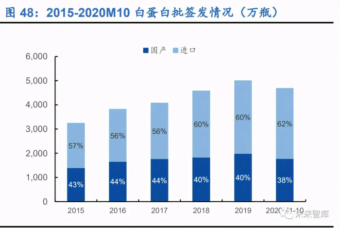国内白蛋白市场依旧是国内血制品市场主力,进口产品占据主导地位。2019-2020 年 来,人血白蛋白在国内所有血制品的批签发占比依旧最高,约为 59%。白蛋白是目 前国内所有血液制品中唯一有进口批签发的产品,且进口产品占据了主导地位,2019 年白蛋白批签发量月 4997 万瓶,其中进口占比达 60%,2020 年 1-10 月批签量达 到 4680 万瓶,进口占比达 62%。