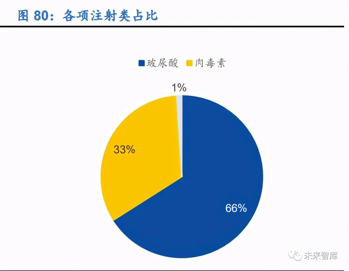 注射类项目市场规模约占行业总体近六成,其中玻尿酸最受欢迎。据新氧大数据预 测,注射类医美项目市场规模行业占比最大,2019 年约 57.04%。其中,玻尿酸注 射占比 66%,肉毒素注射占比 33%。