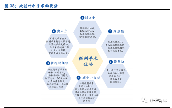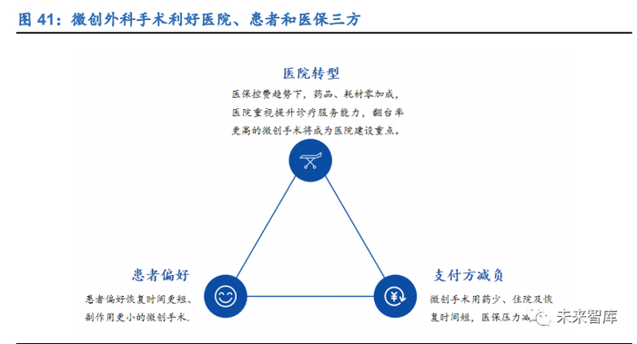 在医保控费的大环境下,微创外科领域未来发展前景巨大。在医保控费趋势下,药品 和耗材零加成,医院将更加重视提升诊疗服务能力,翻台率更高的微创外科将成为医 院的建设重点。从患者的角度来看,也将更加倾向于接受恢复时间更短、手术副作用 更小的微创手术;从医保局的角度看,虽然微创手术价格略高于传统手术,但由于腔 镜手术用药少且患者恢复时间更短,节省大量住院费用,医保支付的压力也将随之缩 小。因此,微创外科领域未来发展前景巨大,是一个有利于支付方、患者、医院和医 生等各利益相关者的黄金赛道。