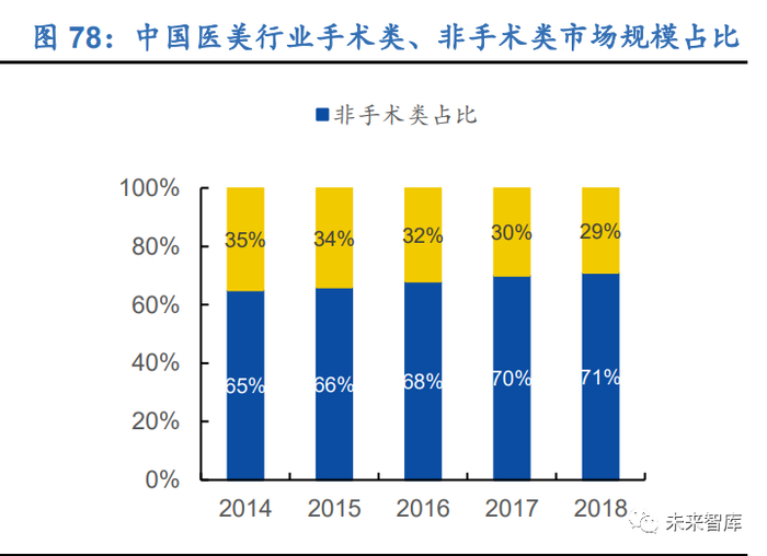 (2)中游服务机构,主要包括公立机构如二甲以上医院的整形美容科室、医疗美容 专科医院;民营机构如医疗美容医院、门诊和诊所等。
