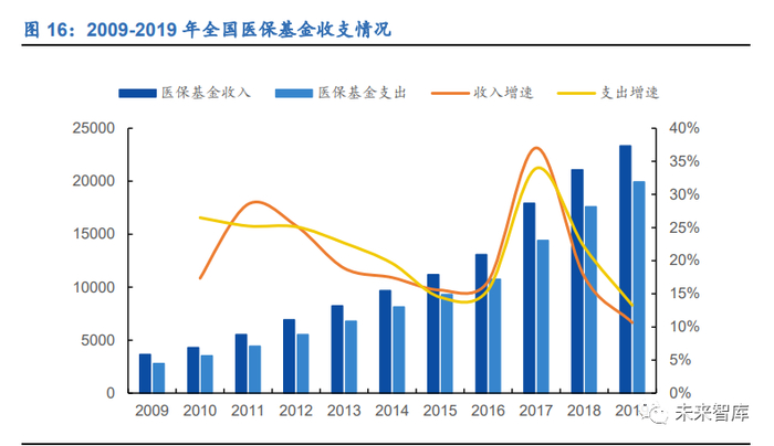 从国家医保层面来看,医保基金面临较大的可持续压力。根据医保局《2019 年医疗 保障事业发展统计快报》,截至 2019 年底,我国全口径基本医疗保险参保人数 1.35 亿人,全年基本医疗保险基金总收入为 23334.87 亿元,同比增长 10.6%,总支出为 19945.73 亿元,同比增长 13.3%,年末累计结存 26912.11 亿元,支出增速高于收 入增速,结余增速放缓,医保基金持续紧张。同时,考虑到在 2020 年经历新冠疫情, 医保资金经历了更为严峻的考验。