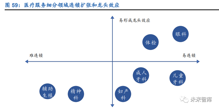 从业务模式上来看,体检、眼科对于医师资源和专家效应的依赖程度相对较低, 业务易实现标准化和流程化,门店扩张后上游议价、下游销售能力提升,规模效 应下龙头易获取超额利润;精神科、辅助生殖、牙科、妇产科、医疗美容业务也 较易实现标准化和流程化,但规模效应较弱,同质化服务下较难实现龙头效应与 超额业绩。