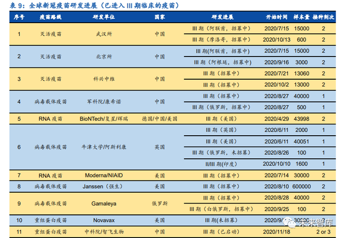 全球范围积极推动新冠疫苗研发,超过 200 款新冠疫苗在研,国内已有 5 款疫苗进 入 III 期临床。根据 WHO 公布的新冠疫苗候选名单,截至 11 月 12 日,全球已有超 过 200 款新冠疫苗产品正在研发中,这之中共有 48 款产品已经进入临床试验阶段, 其中国内共 11 款疫苗进入临床试验,另有 4 款进入临床试验的疫苗为中外合作研 发。研发进度领先的 11 款新冠疫苗已经进入 III 临床试验,部分疫苗甚至已经公布 III 期临床试验数据,国内有 5 款新冠疫苗进入 III 期临床试验。